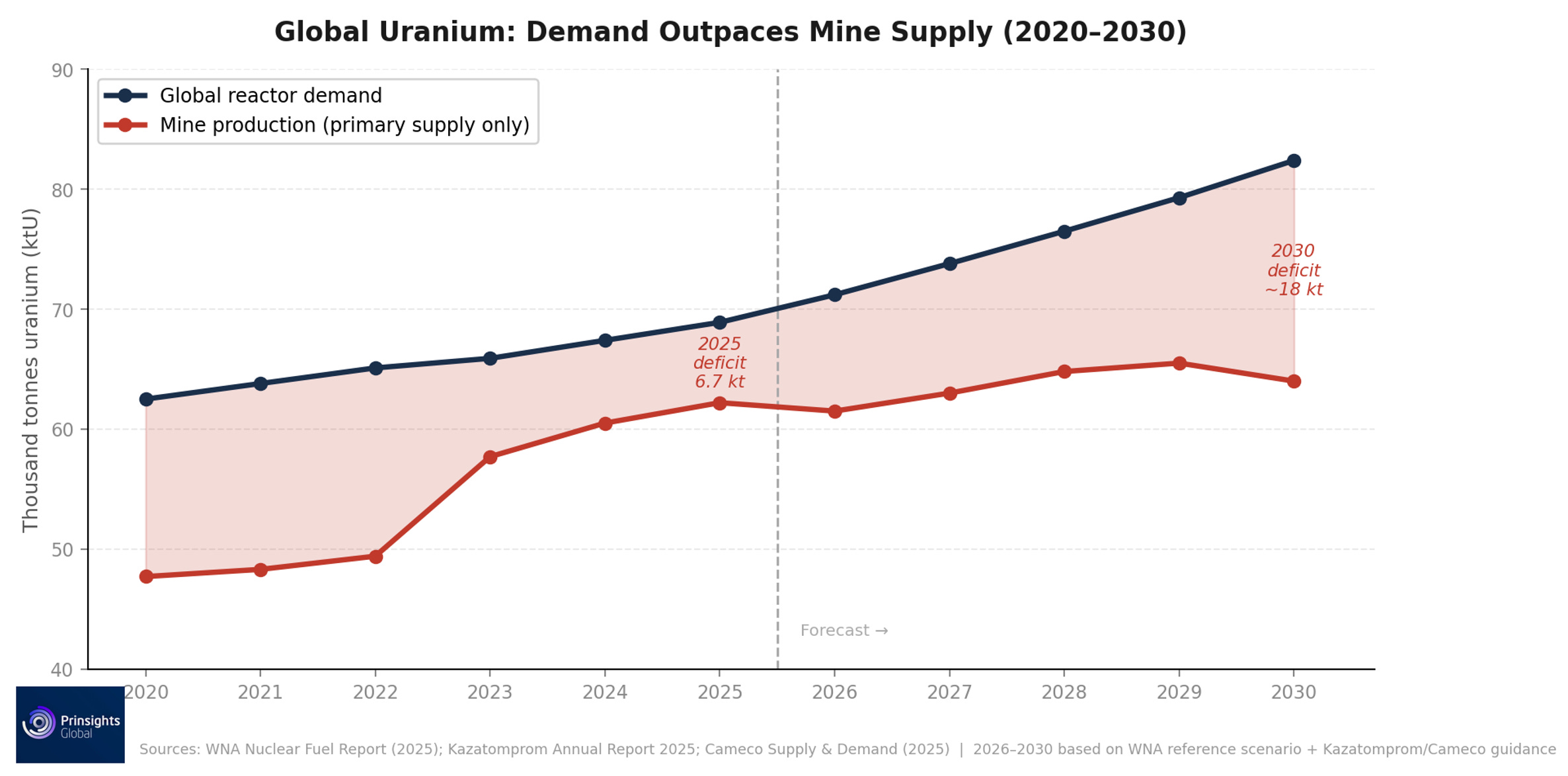 The two largest new projects in the pipeline are Denison’s Phoenix ISR mine in Saskatchewan, which is targeting first production in mid-2028 pending final regulatory approval, and NexGen’s Rook I, which just received its construction licence and is expected to come online around 2030. Neither project would come near to closing the U.S. or global supply-demand gap.